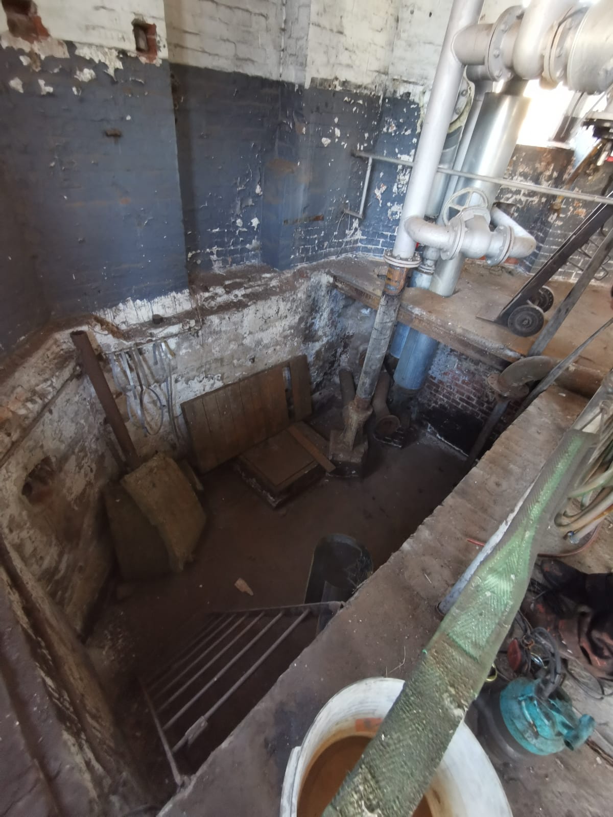 Oberhalb der Zwischendecke erreicht man den Vorratsbehälter. Eine weitere Treppe führt nach oben zum oberen Rand des Behälters