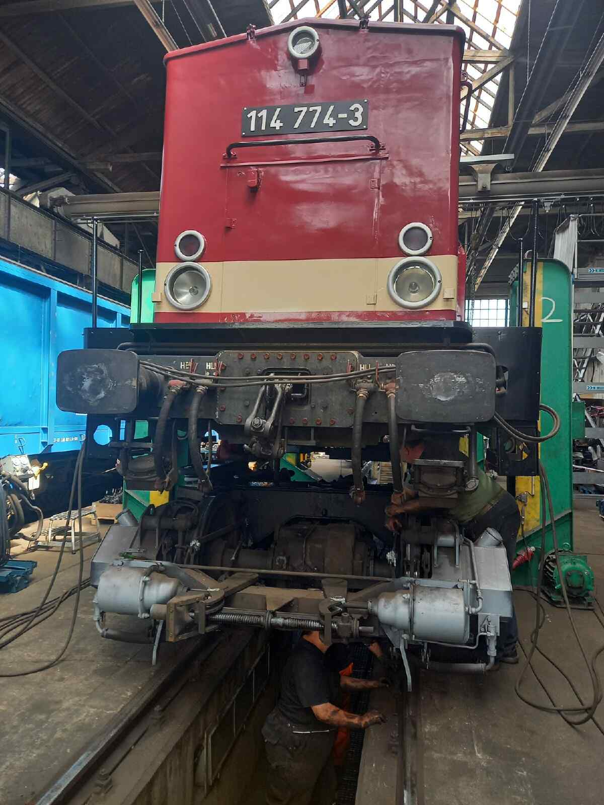 Am vergangenen Samstag wurde ein weiterer großer Schritt bei der Hauptuntersuchung unserer Diesellok 114 774 geschafft. Nachdem nun alle Arbeiten am Fahrwerk und am Rahmen der Lokomotive abgeschlossen wurden, konnte die Lokomotive wieder auf ihre „eigenen Füße“ gestellt werden. Das bedeutete für die Aktiven, dass sie die Lok wieder auf ihre Drehgestelle und damit auf ihre eigenen Achsen stellen mussten. Das war ein spannender Moment und Millimeterarbeit, hat aber zur großen Erleichterung der Beteiligten gut geklappt. Natürlich haben wir bei dieser Aktion auch ein paar Fotos aufgenommen, die wir Ihnen nicht vorenthalten möchten.
