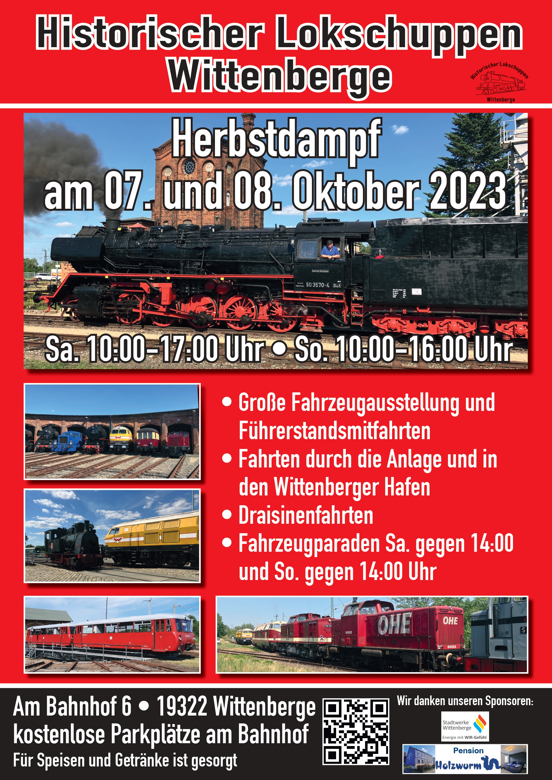 Und zu guter Letzt möchten wir heute und an dieser Stelle schon einmal auf unseren „Herbstdampf“ hinweisen, ein buntes Lokfest für die ganze Familie mit jeder Menge Aktivitäten im Lokschuppen und Sonderfahrten in den Wittenbergener Hafen.