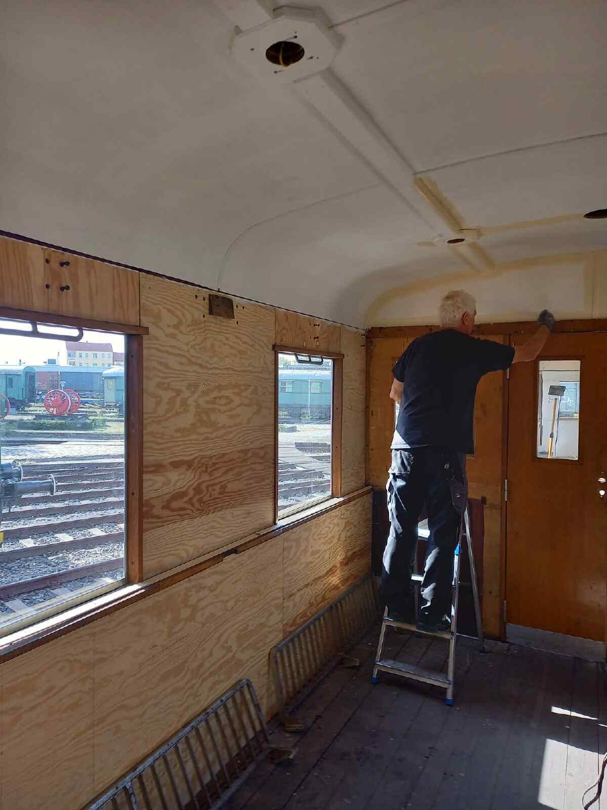 Neuigkeiten gibt es auch vom Wagen 197 805, dessen Innenleben ja schon seit Längerem einer grundlegenden Renovierung unterzogen wird. Langsam erkennt man aber schon, wie schön es werden wird. Wir konnten den Einbau der hölzernen Wandverkleidungen und der Deckenverschalung abschließen und die Decke fertig lackieren.