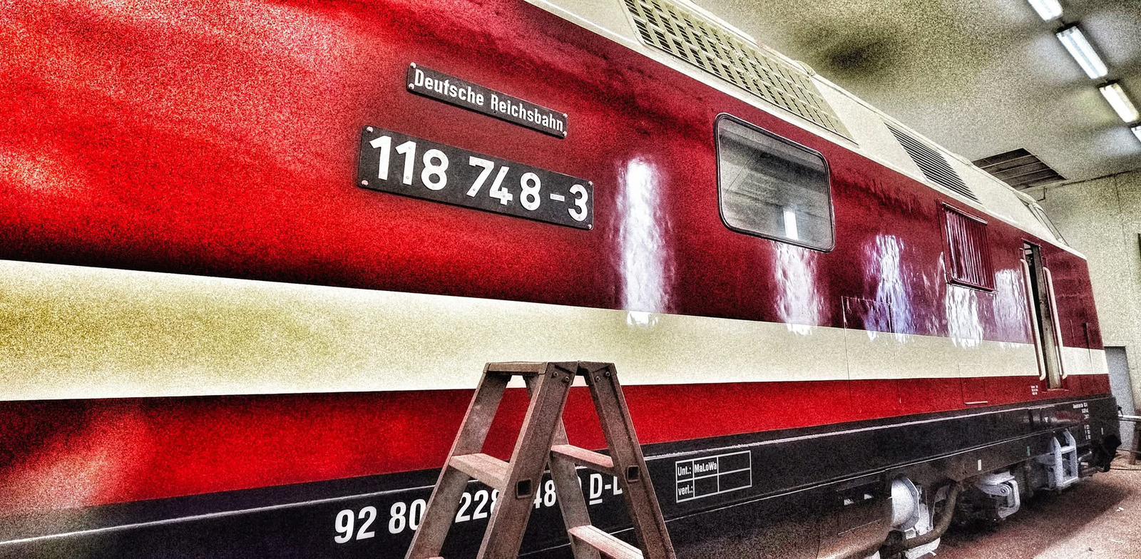 schon wieder ist ein Jahr vergangen und wir steuern auf Weihnachten und den Jahreswechsel zu. Natürlich denkt man dabei auch an Geschenke. Das tun wir auch. So freuen wir uns besonders über unser größtes Weihnachtsgeschenk dieses Jahr. Unsere Diesellok 118 748 ist nun wieder betriebsfähig. Ein paar Worte zu der Lok: Sie wurde 1968 bei beim VEB Lokomotivbau Karl Marx in Potsdam-Babelsberg gebaut, verfügt über zwei Dieselmotoren mit je 1.200 PS und darf maximal 120 km/h schnell fahren. Damit ist sie eine Universallok, die sowohl im Personen- als auch im Güterverkehr eingesetzt wurde. Nach ihrer Abstellung durch die Deutsche Bahn AG im Jahr 1999 wurde sie an die Mitteldeutsche Eisenbahn verkauft, die sie in 2020 an die Firma PRESS weitergab. Seitdem bereichert sie unsere Fahrzeugsammlung, bisher allerdings nur als funktionsfähiges Ausstellungsobjekt ohne Streckenzulassung. Im Jahr 2023 erwarb ein Mitglied unseres Vereins die Lok. In den letzten Monaten wurde sie grundlegend bei der Firma Malowa in Klostermansfeld am Ostrand des Harzes aufgearbeitet. Im Rahmen der Arbeiten wurden unter anderem die Motoren, Drehgestelle, Achsen und Bremsen instandgesetzt. Außerdem erhielt sie eine zeitgemäße Zugsicherungs- und Funkanlage, um sie auch für einen Einsatz auf Strecken der Deutschen Bahn AG zu ertüchtigen. Nach Abschluss der technischen Arbeiten hat sie in den letzten Tagen eine neue Lackierung erhalten hat und erstrahlt jetzt wieder im alten Glanz in rot/weißer Farbgebung. Die ersten beiden Fotos zeigen sie vor einigen Tagen noch in der Lackierhalle einer bekannten Eisenbahnwerkstatt in Klostermansfeld. Keine Angst, die schwarzen Streifen, die im Lack der Lok zu erkennen sind, reflektieren nur die Umgebung.