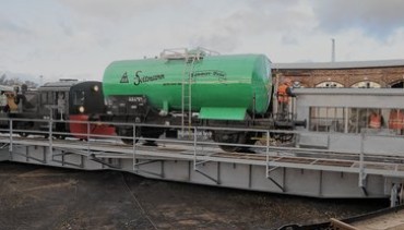 Es ist bereits später Nachmittag, als die Rangierlok den Bierwaggon auf die Drehscheibe schiebt. Wenig später rollt er durch das Tor 13.